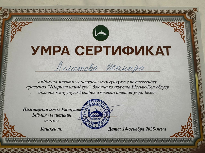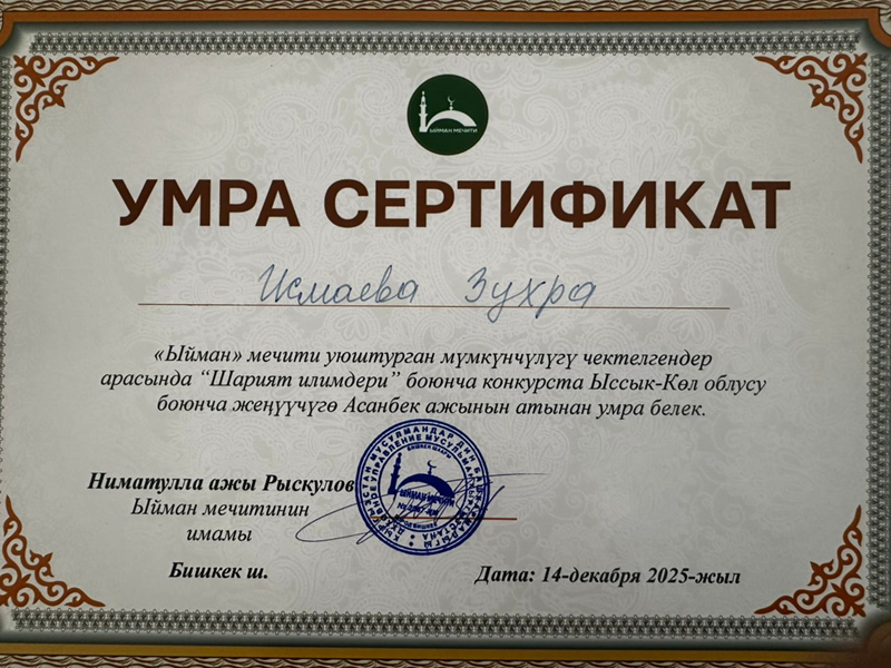 Ысык-Көл облусунун Каракол шаарында муфтияттын демилгеси, Бишкек шаарындагы «Ыйман» мечитинин уюштуруусу менен мүмкүнчүлүгү чектелген жарандар арасында «шарият илимдери» боюнча конкурс өткөрүлүп, анда эки жеңүүчүгө умра сапарына жолдомо ыйгарылды.