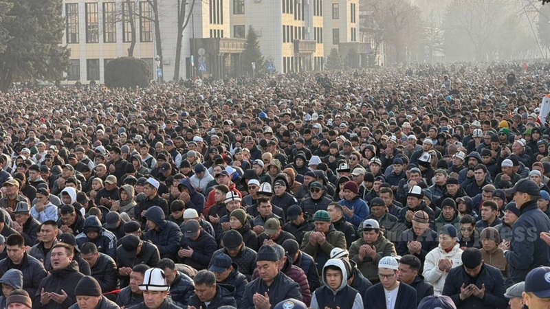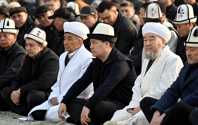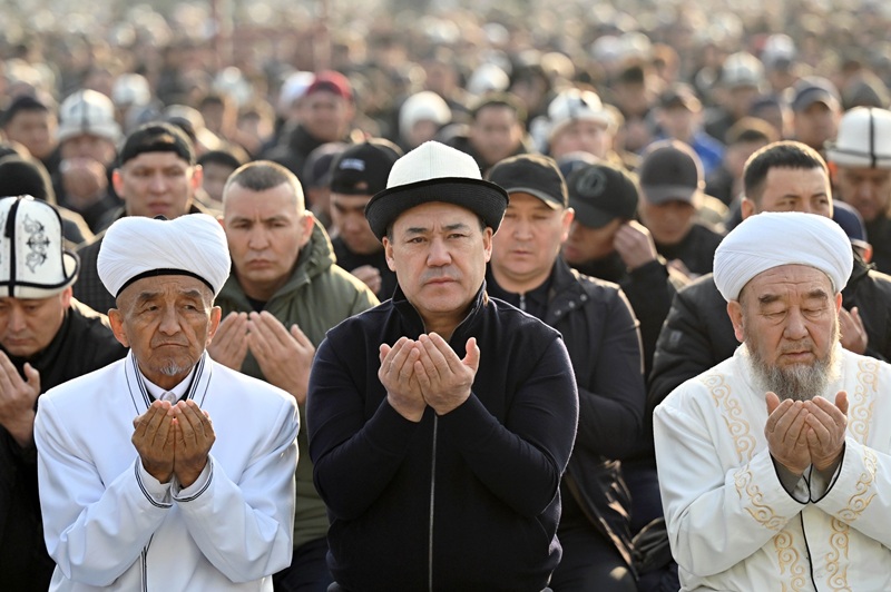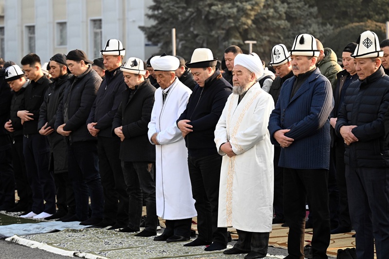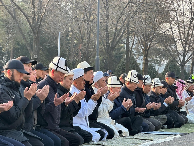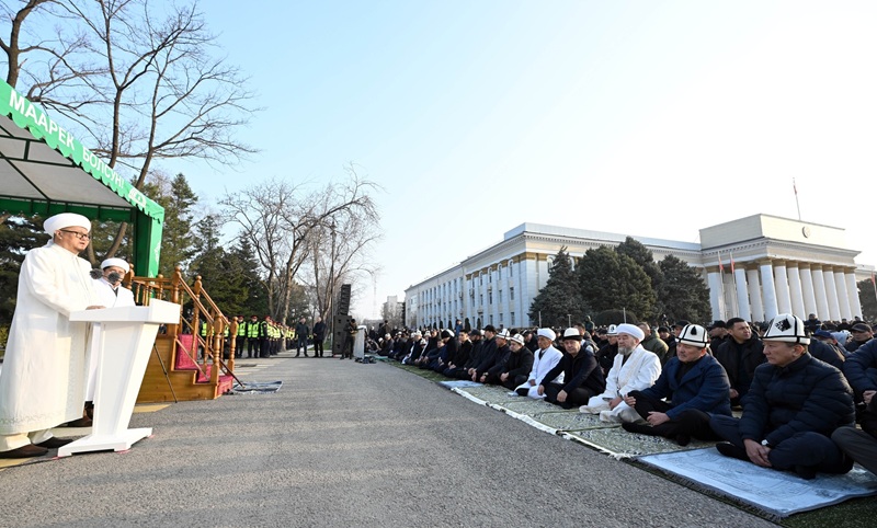Майрамдык намаз Кыргызстандын миңдеген жарандарынын катышуусунда Бишкек шаарындагы Турдакун Усубалиев атындагы Эски аянтта өттү.