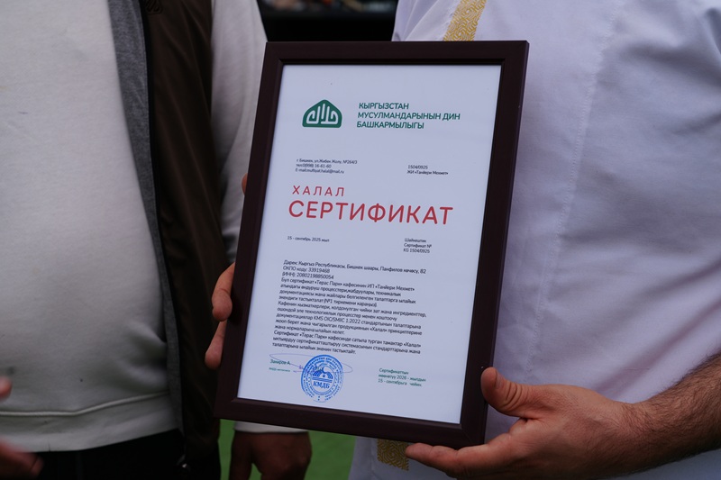 Бишкек шаарында жайгашкан «Терас Парк» кафеси Муфтияттын халал иштери боюнча кызматтарды жана продукцияларды сертификациялоо бөлүмүнөн адалдыгын тастыктаган сертификат алды. Бул тууралуу КМДБнын бөлүм башчысы Бактияр ажы Токтогазы уулу билдирип, аталган кафенин калайыкка сунган тамак-ашы жана азык-түлүктөрү толугу менен шарияттын халал стандарттарына дал келерин маалымдады.